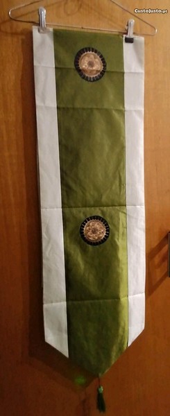 Preço: 25 €Caminho (toalha) de mesa em tecido acetinado verde e branco com lindos bordados em tons de beje