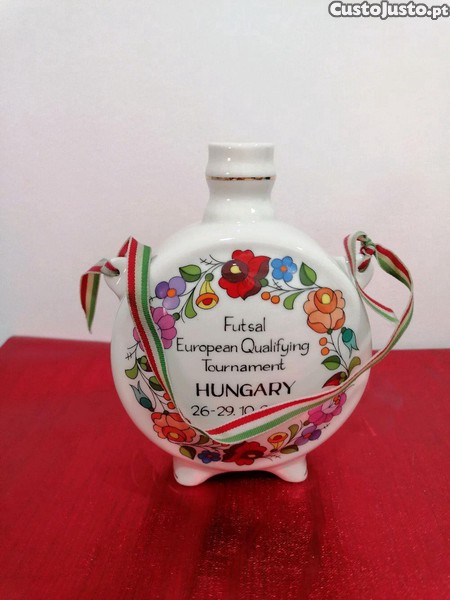Preço: 30 €Cantil porcelana húngara pintada à mão, inscrição Torneio europeu qualificação Futsal 26-29.10.2000