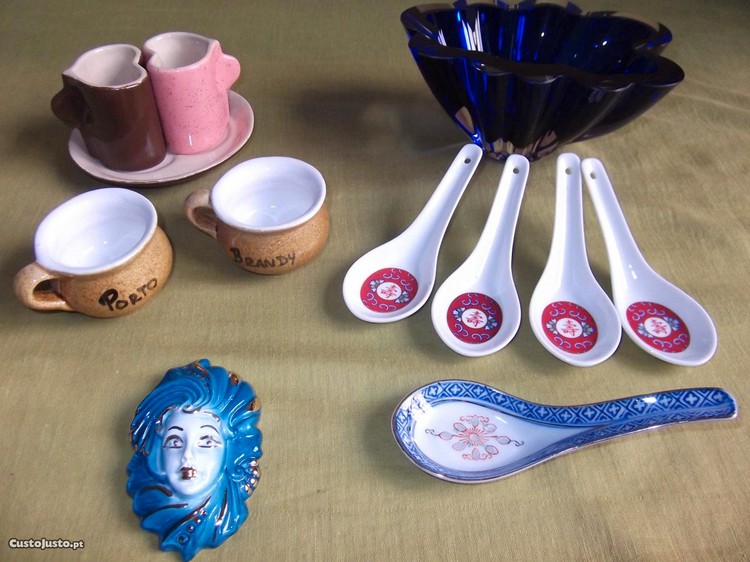 Preço: 4 €Chávenas, taça, colheres e máscara em porcelana