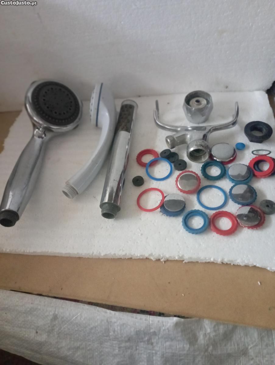 Chuveiros, usados, um suporte e vários acessórios para torneiras.