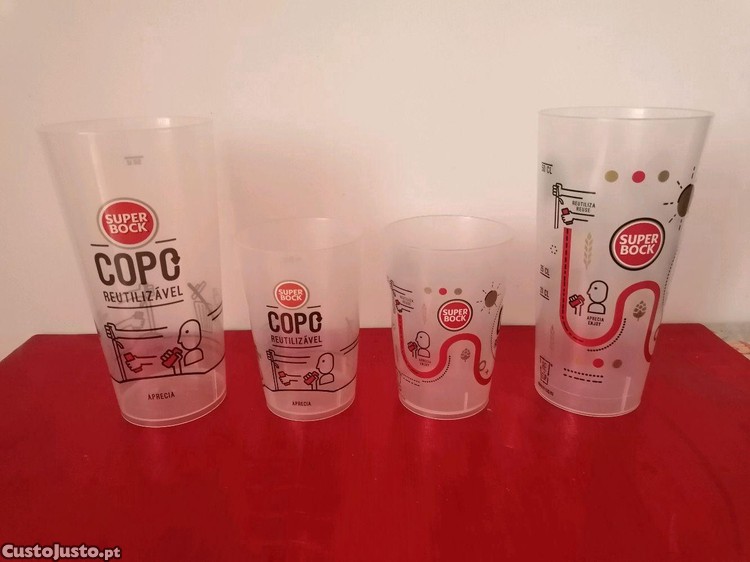 Preço: 8 €Conjunto de 4 copos em plástico com publicidade à cerveja Super Bock e Somersby