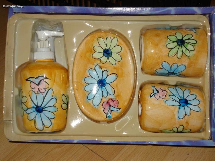 Conjunto novo e ainda embalado com saboneteira, doseador de sabão, copo para as escovas de dentes e copo.