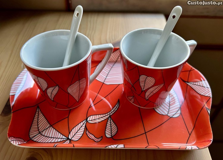 Conjunto de duas chávenas com colheres em louça e tabuleiro para servir.