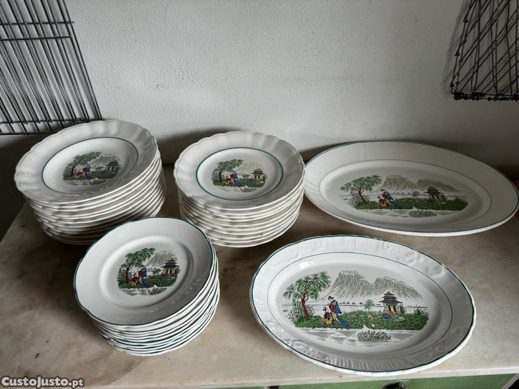 conjunto composto por 10 pratos rasos ( com marcas de uso) 12 pratos de sobremesa 12 pratos de sopa 1 travessa grande (com marcas de uso 1 travessa pequena ( com marcas de uso) 2 chávenas grandes ( uma delas com marcas de uso)