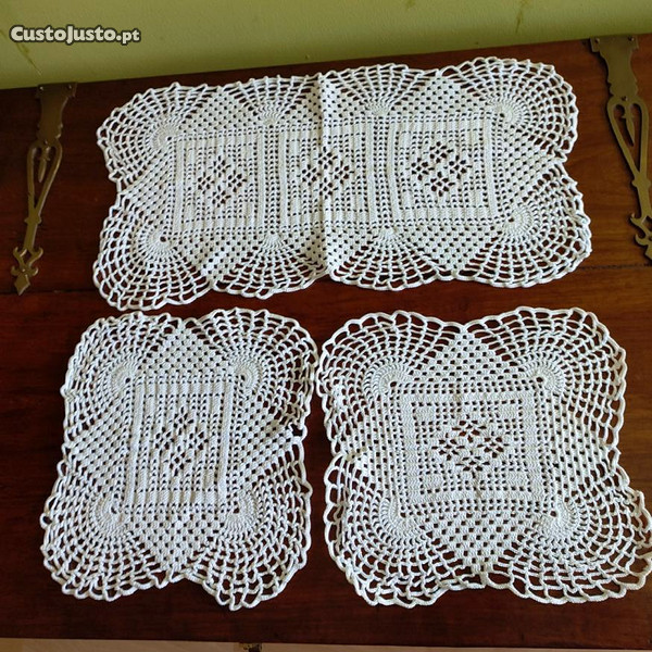 Conjunto em crochet branco, para cómoda, 44x 23 cm, e mesas-de-cabeceira, 23x21 cm nunca usado, excelente estado. Recolha a cargo do comprador. Preço negociável.