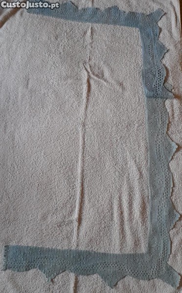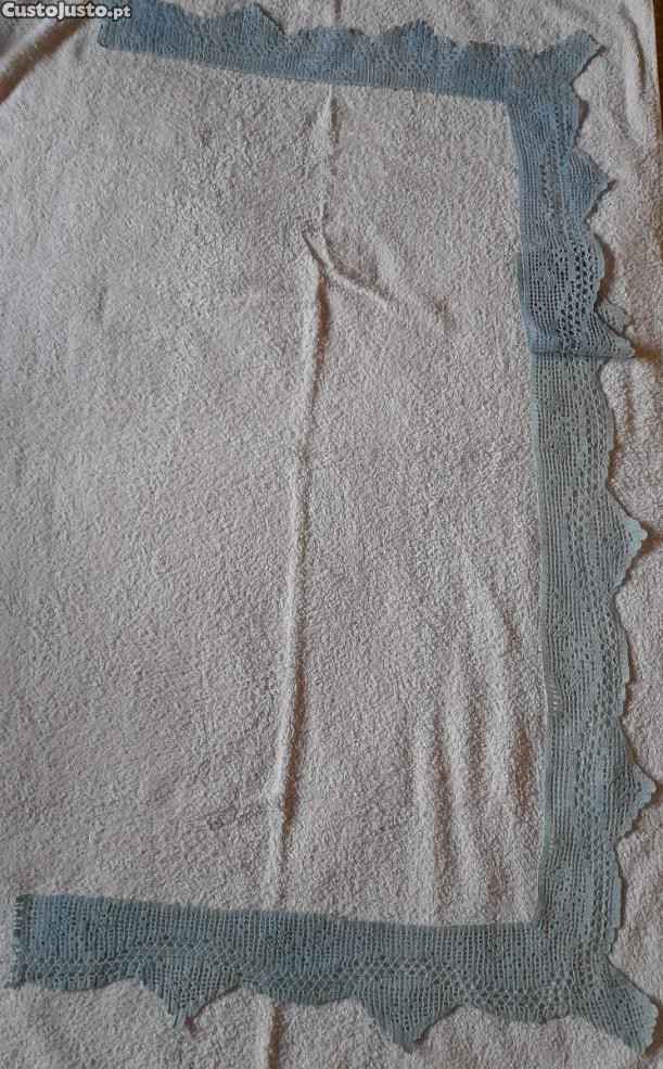Entremeio antigo em renda manual para aplicar em lençol cor azul claro com linha N.60 e com comprimento exterior de 1,20 m.