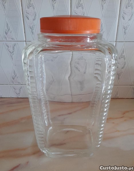 Tem 24 cm de altura e pesa cerca de 2 kilos porque o vidro é muito grosso. A tampa é de baquelite. Em excelente estado de conservação, sem quebras ou fissuras. Leva 2,5 litros.
