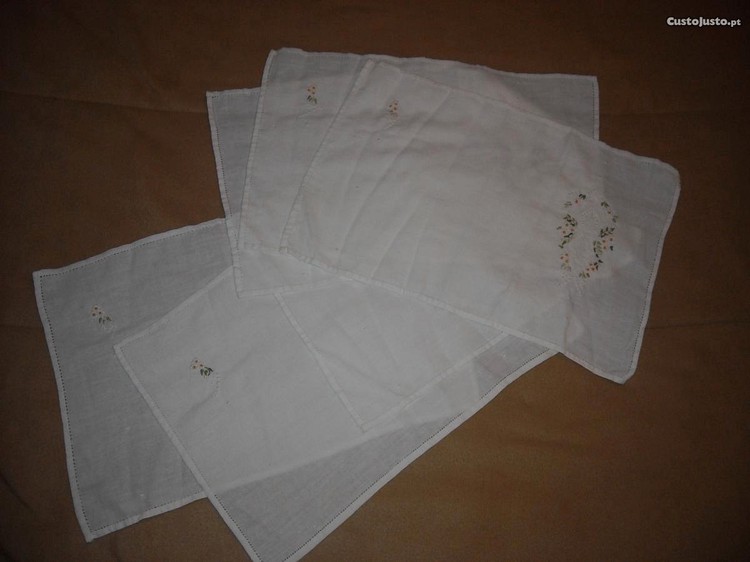 Guardanapos antigos em estado novo, executados em linho fino com bordados coloridos feitos á mão