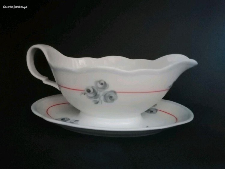 Preço: 15 €Lindíssima e fina molheira loiça antiga decorada com singelas rosas cinza, porcelanas Vista Alegre