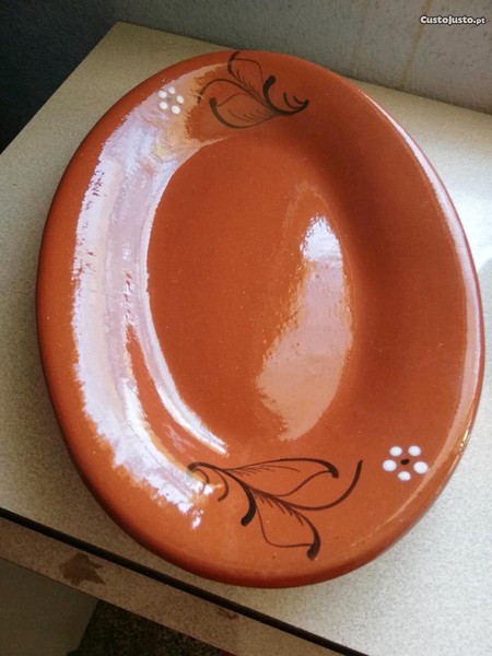 Tacho em barro com 16 cm diâmetro por. 9 cm altura, travessa com 30 cm comp por 20 cm largura. Novo por estriar.