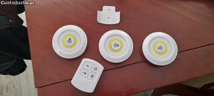 Conjunto de três luzes led, redondas com autocolante para fixar onde quiser, ex armários, bancadas cozinha, roupeiros escadas, etc.