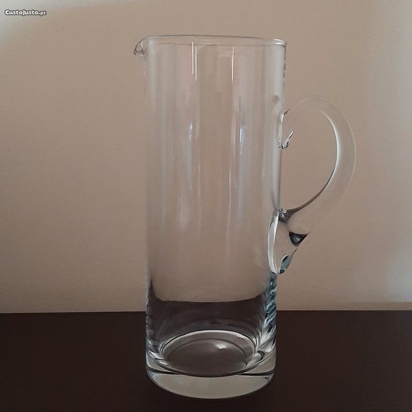 Elegante jarro de vidro redondo e reto e de base grossa e robusta.