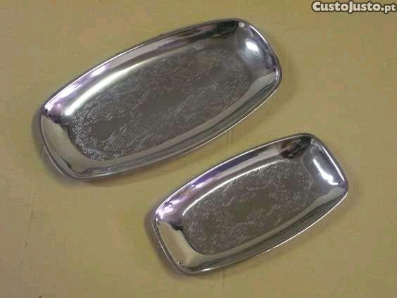 Par de pequenas travessas de metal cromado, ornamentadas com gravações de motivos florais estilizados. Podem ser usadas para servir aperitivos, entradas ou pequenas sobremesas. A travessa maior mede 21,5 cm x 14,5 cm e a mais pequena mede 15,5 cm x 8,5 cm. Estão como novas, muito pouco usadas. Não vendo em separado e o preço anunciado diz respeito às duas. Barato para desocupar. Negociável, vendo pela melhor oferta. Possibilidade de entrega em mão.
