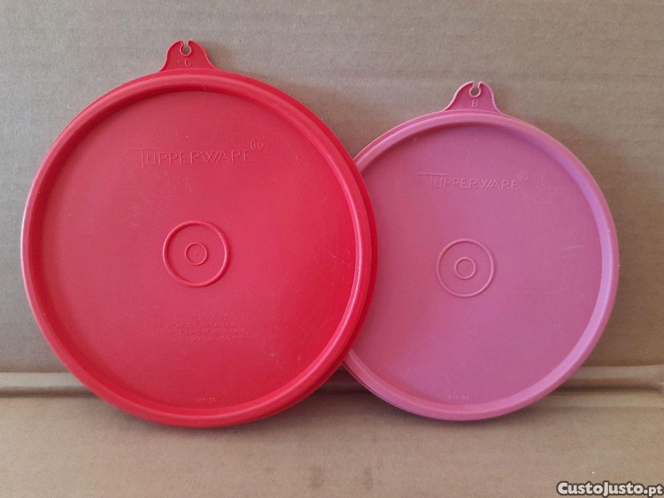 Par de tampas circulares de caixas redondas da marca Tupperware. Servem para os modelos Wonderlier Bowls ou outros. Uma de cor vermelha e outra de cor rosa, medem respectivamente 14,7 cm e 13,3 cm de diâmetro interior medidos na fenda de encaixe. Estão em bom estado. Não vendo em separado e o preço anunciado diz respeito às duas. Barato para desocupar. Negociável, vendo pela melhor oferta.