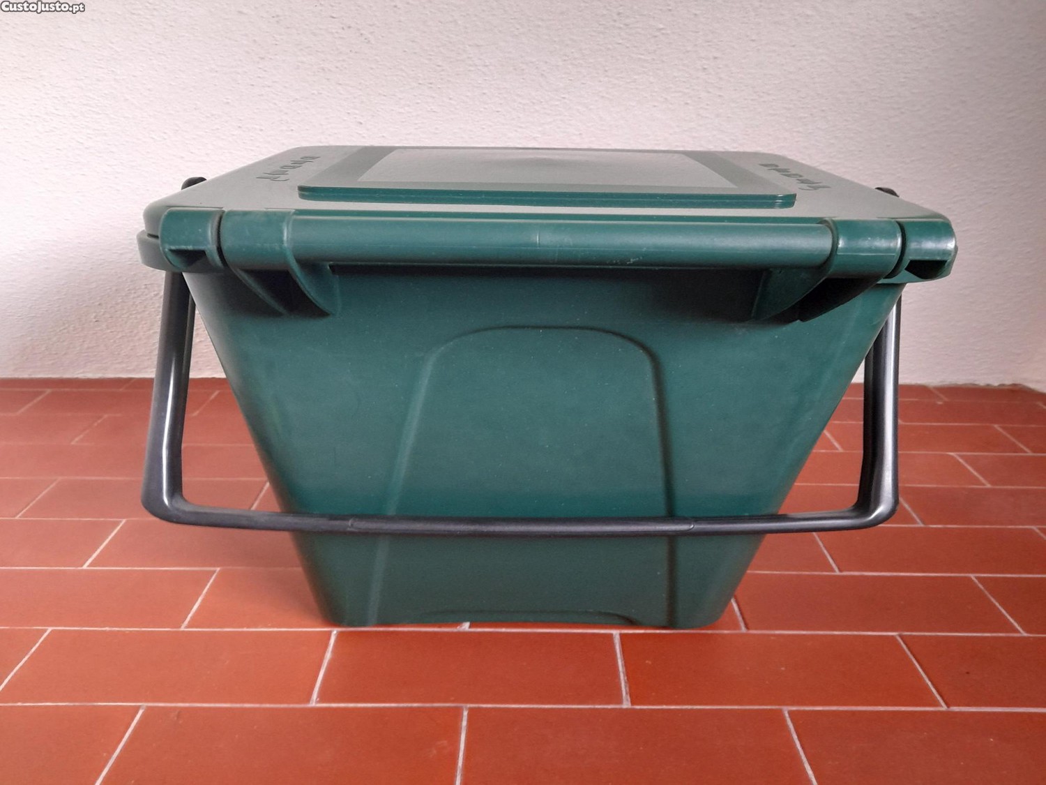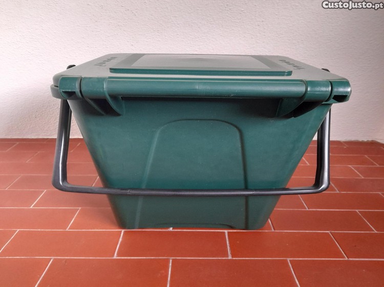 Vendo pequeno contentor de lixo em plástico resistente de côr verde escuro. O contentor tem um mecanismo de bloqueio na tampa para fecho seguro através das alças. Fabricado no Reino Unido pela MGB Plastics.