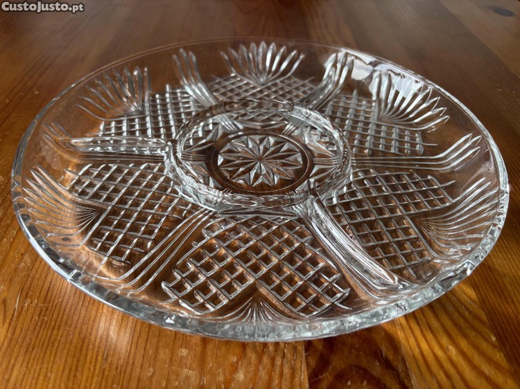 Prato de vidro tralhado com 7 compartimentos para servir petiscos.