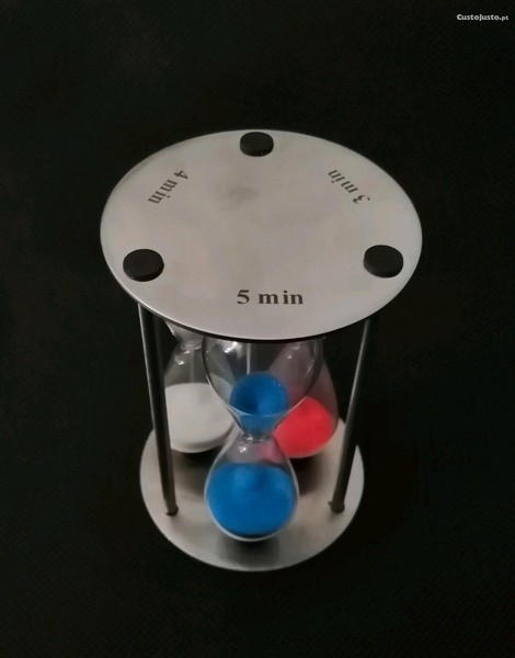 Artigo Kitchen timer, " relógio temporizador de cozinha " com 3 ampulhetas para 3, 4 e 5 minutos, sendo uma peça muito útil para quando se está a cozinhar, apresenta um design moderno e diferente sendo uma peça nova na sua embalagem que se encontra como fotos no anúncio.