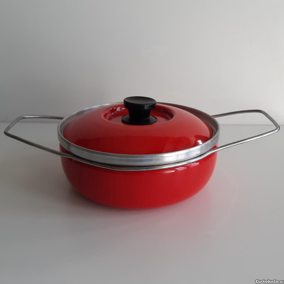 Em ferro esmaltado vermelho vivo, branco no interior. Pegas em aço inox.