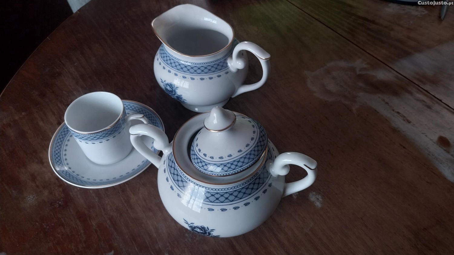 Conjunto de café original Vista Alegre, padrão Brest (azul com friso dourado), em excelente estado de conservação.