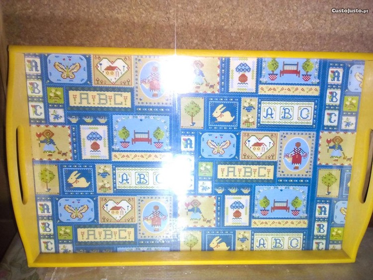 Preço: 15 €tabuleiro amarelo c/tecido a imitar ponto cruz e vidro