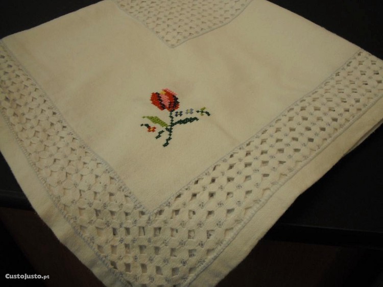 -1 Toalha de mesa quadrada em pano tipo quadrilet bordada a Ponto de Cruz com bainhas abertas no fim. Foi usada uma vez, num chá de amigas.