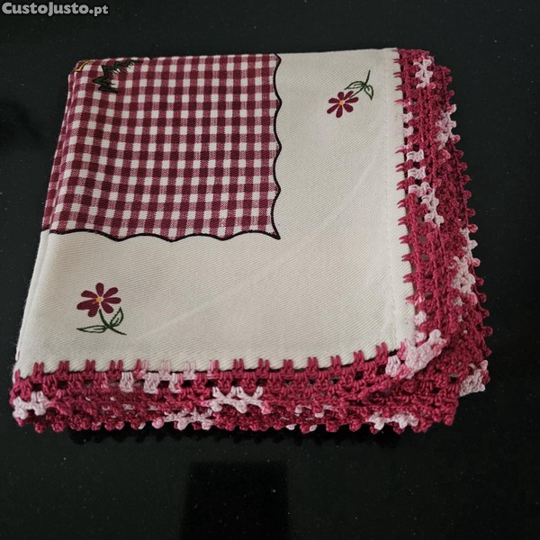 Toalha de centro de mesa em tons de branco e vermelho escuro/ bordeaux com desenhos de patos e flores e acabamento em croché. Tudo feito à mão. Nunca foi usada, está nova a estrear.