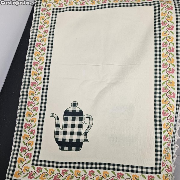 Toalha de mesa de cor creme com acabamentos em tricô da marca Felular. Com desenho de uma cafeteira verde e flores. Fabricada em Portugal. O material é 100% algodão. Nunca foi usada, está como nova.