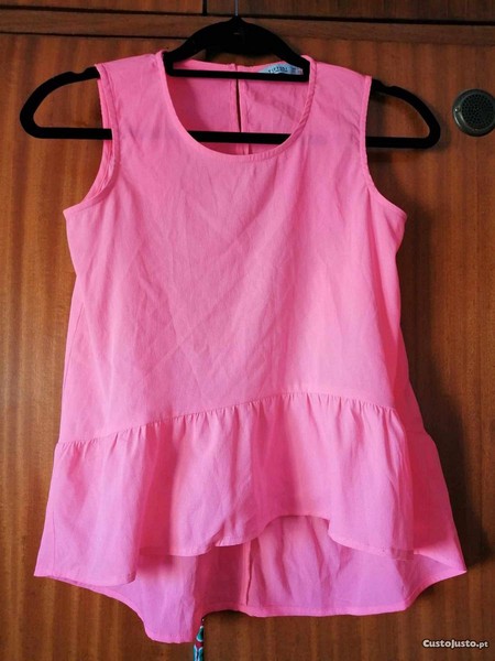 Blusa de decote redondo e manga cava. Fecho traseiro com botão. Pormenor de folhos.
