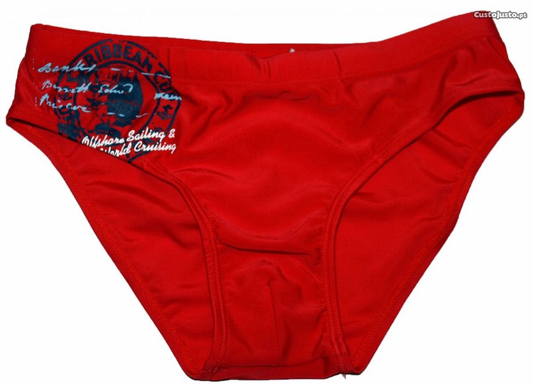 Vermelho, com um motivo discreto como que um carimbo. Têm elástico na cintura e cordão para ajustar melhor.