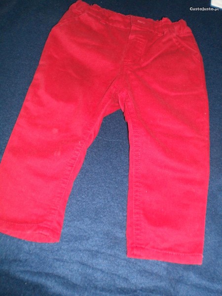Calças vermelhas com 22 cm de cintura e 42 cm de altura.