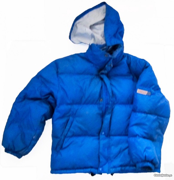 É Impermeável e muito quentinho, muito útil, prático e confortável. Tem capuz, que pode recolher para uma bolsa situada por baixo da gola. Todo ele em tom de azul forte, não possui quaisquer estampagens. Tem bolso interior e dois bolsos laterais, com fecho éclair e molas para garantir uma eficaz protecção do frio e da chuva.