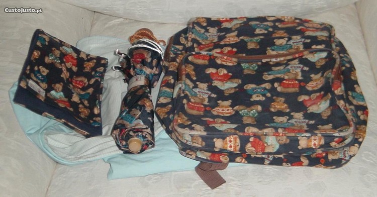 Para os passeios e/ou para uso escolar, um conjunto de mochila, cachecol, guarda chuva desdobrável e mala de transporte, com motivos de ursinhos a condizer em todas as peças. Marca alemã de muita qualidade "bb for kids".