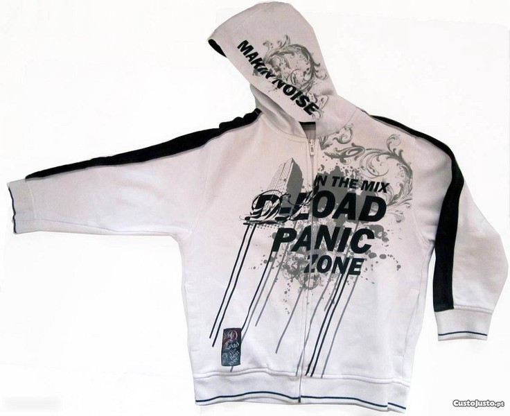 Outra - Com capuz e fecho eclair à frente. É branco e tem motivo estampado numa manga, num dos lados do capuz e à frente, em tons de preto e cinza.