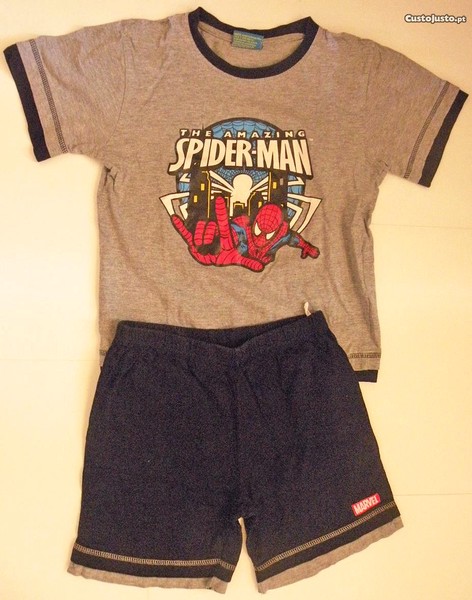 A t-shirt de manga curta é de cor base cinza médio e tem uma barra preta sobreposta, em baixo e nas mangas. À frente possui a impressão do Homem Aranha com o movimento de lançar teias, com a frase The Amazing Spider-Man por cima. O calção é completamente preto, com uma barra sobreposta a cinza, com elástico na cintura, para melhor ajustar ao corpo. É muito prático e confortável e as crianças adoram o personagem.