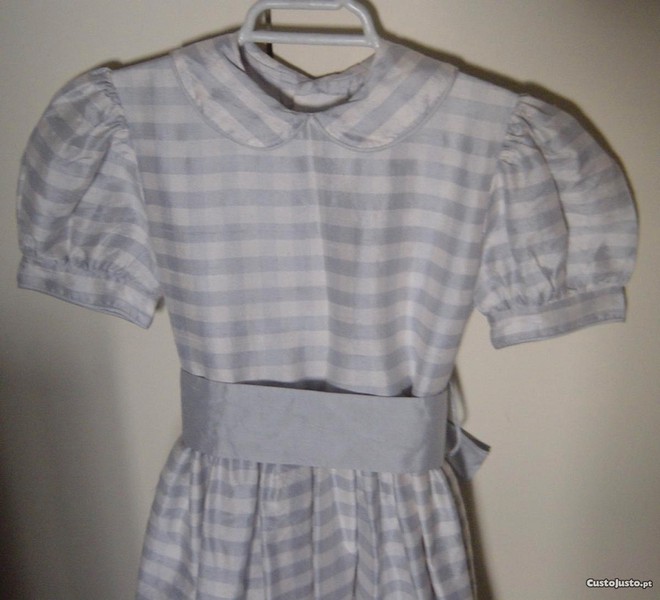 -- DESCRITIVO: Vestido de menina em seda de excelente qualidade, com padrão às riscas azuis claras e brancas. Decote redondo e gola princesa rematada em seda azul clara. Mangas de balão pregadas e macheadas debruadas no mesmo tecido padrão do vestido e rematadas com seda azul de forma semelhante à gola. Cintura franzida com aperto através de uma faixa em seda azul clara presa aos lados através de duas presilhas, Solta na parte de trás por forma a poder dar um laço de remate nas costas. Abotoamento nas costas com cinco botões forrados a seda azul clara igual à da faixa. Vestido inteiramente forrado.