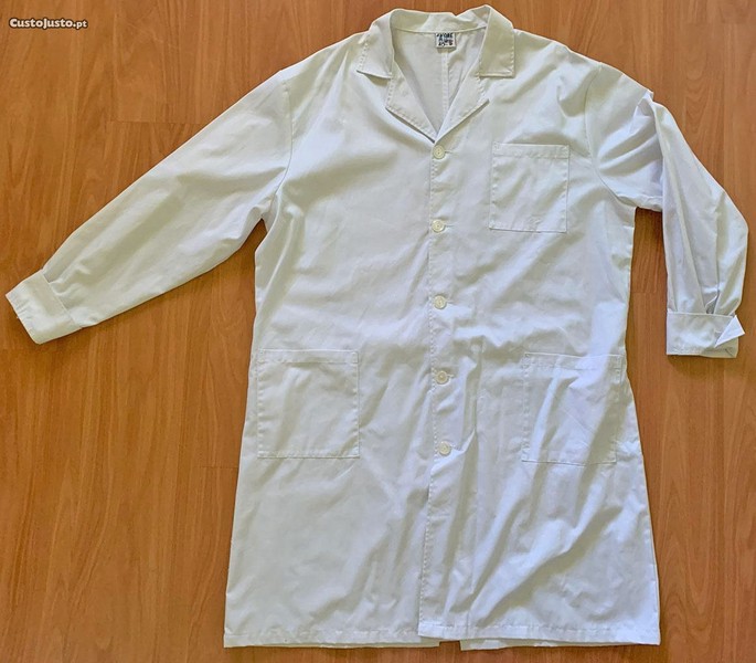 É de excelente qualidade, em tecido com bastante consistência. De cor completamente branco, não tem quaisquer tipos de estampado. Possui mangas compridas e fecha à frente com botões transparentes, formando um colarinho e decote em V. Tem dois bolsos de chapa à frente em baixo um bolso à frente, ao peito, do lado esquerdo e as mangas terminam em punho que aperta com um botão transparente. Possui uma fita nas costas que permite ajustar a cintura, conforme interessar e uma grande acha a meio para permitir movimentos completamente livres. É muito moderno, prático, confortável e muito útil, muito utilizado nas escolas, universidades e em outras actividades.