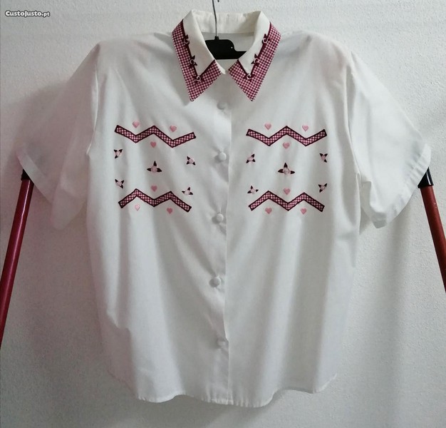 Blusa branca com corações e flores bordados em rosa claro e magenta (quase vermelho), e outras aplicações.