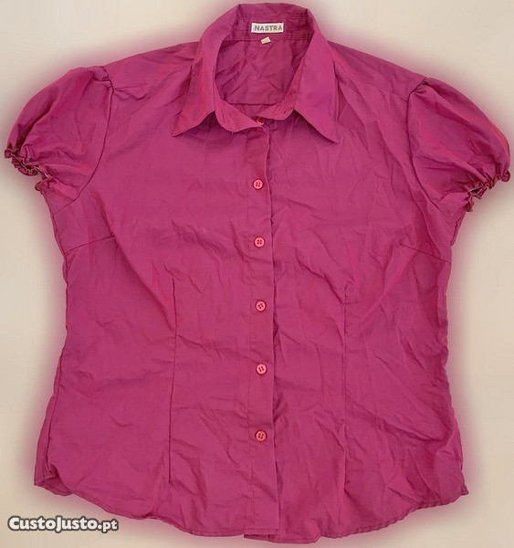 É de excelente qualidade, em tecido muito leve e fresco. Da reconhecida marca Nastra, de cor completamente rosa forte, não possui qualquer estampado. Com mangas pequeníssimas mangas, a terminar em folhinho elástico, criando uma espécie de balãozinho. Tem um corte moderno, cintado, favorecendo a silhueta. Aperta à frente com pequenos botões, da mesma cor e tem ombros reforçados. É invulgar e original, com um estilo muito prático e moderno, mas algo sofisticado, muito versátil, muito elegante e confortável. Pode ser usada com diferentes combinações e peças, criando estilos muito diversos, combinando muito bem com qualquer tipo de estilo e ocasião, sejam elas mais formais ou mais casuais e descontraídas, dependendo das peças com que combina. Foi usada apenas uma vez.