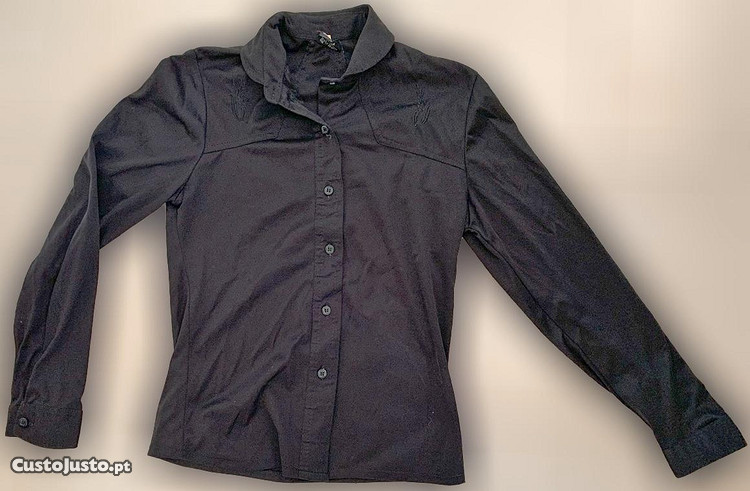 É de boa qualidade, em tecido muito leve e ligeiramente transparente. Da reconhecida marca Gori, de cor completamente preto, não possui qualquer estampado. Com mangas compridas, a terminar em punho e a apertar com um pequeno botão quadrangular na mesma cor. Tem um corte moderno, ligeiramente cintado, favorecendo a silhueta. À frente na zona dos ombros até ao nível do peito tem um bordado de cada lado, a linha preta também. Atrás, em zona idêntica à da frente possui espécie de recorte bainhado como adorno. Aperta à frente com pequenos botões quadrangulares, da mesma cor. É invulgar e original, com um estilo muito prático e moderno, mas algo sofisticado, muito versátil, muito elegante e confortável. Pode ser usada com diferentes combinações e peças, criando estilos muito diversos, combinando muito bem com qualquer tipo de estilo e ocasião, sejam elas mais formais ou mais casuais e descontraídas, dependendo das peças com que combina. Foi usada apenas uma vez.
