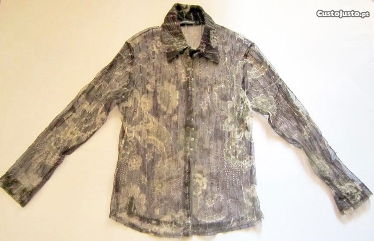 É de boa qualidade. De cor base castanho chocolate, possui um estampado floral em tom dourado. Com mangas compridas e corte moderno, é em tecido franzido elástico e ligeiramente cintada, favorecendo a silhueta. é bastante transparente e aperta à frente com molas escondidas. É toda salpicada por pequenas lantejoulas no mesmo tom, que lhe conferem um brilho especial. É muito invulgar e original, com um estilo prático e moderno, mas algo sofisticado, versátil, elegante e confortável, combinando muito bem com qualquer tipo de estilo e ocasião, sejam elas mais formais ou mais casuais e descontraídas, dependendo das peças com que combina.