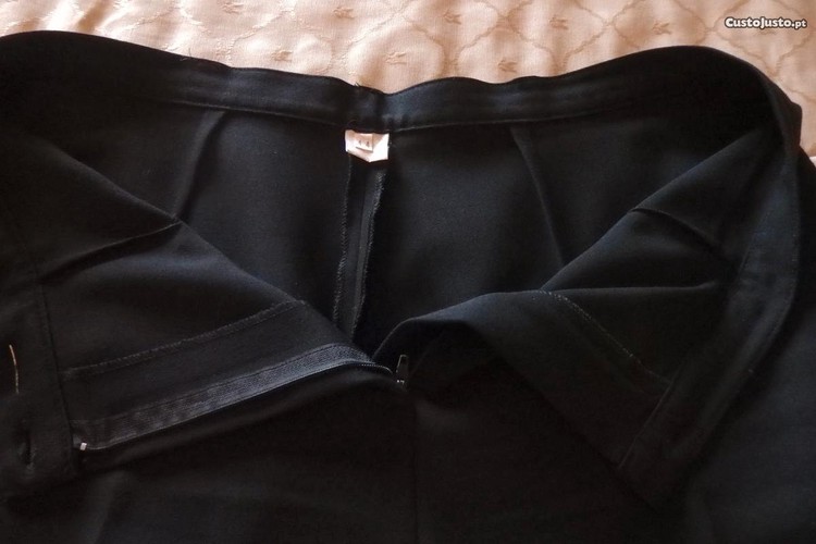 Uma calça preta com 96 cm de altura total e 23 cm de largura ao fundo da perna. Óptimo tecido e em bom estado.
