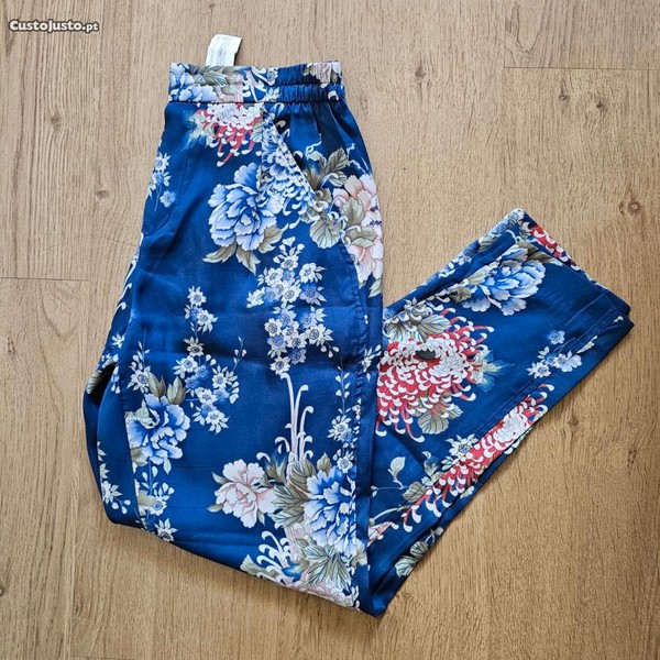 Calças azuis com flores multicoloridas de corte a direito da Zara. A calça tem 2 bolsos na parte da frente. A cintura é de elástico. Usadas 2 ou 3 vezes mas estão em excelente estado. Calças super leves e frescas, ideais para o Verão ou para um dia de Primavera mais quente.