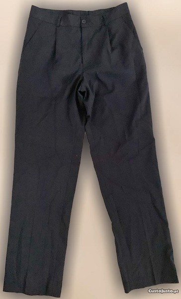 De óptima qualidade, são em tecido muito leve, mas consistente. De cor completamente perto, não possui qualquer estampado e tem vinco nas pernas. Possuem uma cintura média com presilhas para poderem levar cinto. Têm um corte de perna ao estilo recto. Têm um bolso de chapa atrás, que fecha com botão da mesma cor e dois bolsos à frente. Fecham à frente com fecho éclair escondido e botão. São práticas, versáteis, actuais e muito confortáveis. Podem ser usadas em situações e ocasiões mais formais ou mais casuais e descontraídas, dependo das peças com que combinam.