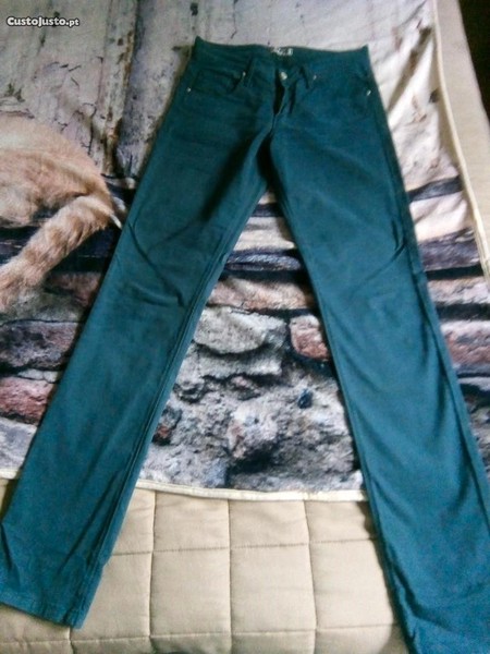 Calças de ganga da marca C&A, número 36, com fecho e bolsos, com alguma elasticidade e cor azul petróleo. Muito macias e confortáveis. Estão por estrear porque não servem.