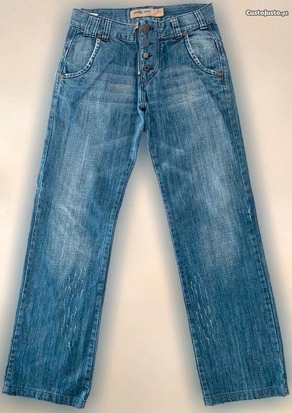 De boa qualidade, são completamente em tom ganga médio e não possuem qualquer estampado. Além de um efeito propositado de usado nas pernas, possuem ainda na zona inferior das pernas uma espécie de desfiar que produzem pequenos riscos aleatórios mas idênticos. Fecham à frente de forma muito invulgar e original com fecho éclair ao lado de um conjunto de botões todos diferentes, em que apenas um realmente aperta, os outros são apenas ornamentos. Possui presilhas para colocação de cinto e têm um corte recto. Possuem dois bolsos de chapa atrás e dois bolsos à frente. São muito invulgares e versáteis, podendo adaptar-se a diferentes situações e ocasiões, mas mais adequadas a contextos mais casuais e descontraídas.