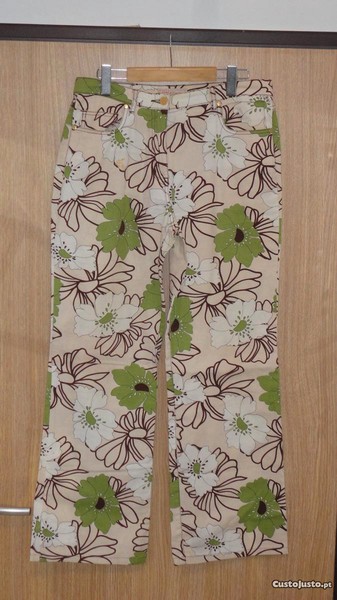 Calças de senhora floridas cor verde e bege Onara. Tamanho 42.