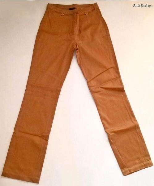 De boa qualidade, em tecido elástico. De cor mel completamente, têm um corte recto justo e fecham à frente com colchete e fecho éclair escondido. Possuem dois bolsos dois bolsos à frente que fecham com botão de mesmo tom. São de elevada qualidade, com um toque muito agradável e suave, num tecido muito bonito. São versáteis e podem ser usadas em ocasiões mais casuais e descontraídas, como em ocasiões mais formais, dependo das peças com que combina.