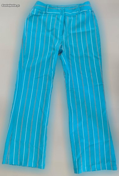 De qualidade, são de tecido muito leve e muito fresco. De cor base azul claro, não têm qualquer estampado, no entanto, possuem risquinhas fininhas verticais a branco e preto. Possuem um corte de perna direito e largo. Possuem presilhas para poder levar cinto e não têm qualquer bolso. Apertam à frente com fecho éclair escondido e botão duplo no mesmo tom de azul. São práticas, versáteis, modernas e muito confortáveis. Podem ser usadas em situações e ocasiões mais formais ou mais casuais e descontraídas, dependo das peças com que combinam.