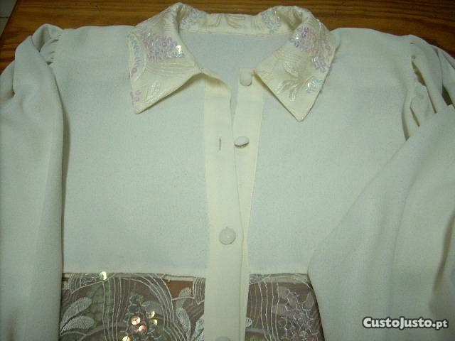 Camisa bordada e com lantejoulas no colarinho, parte da frente e costas. Tamanho M.