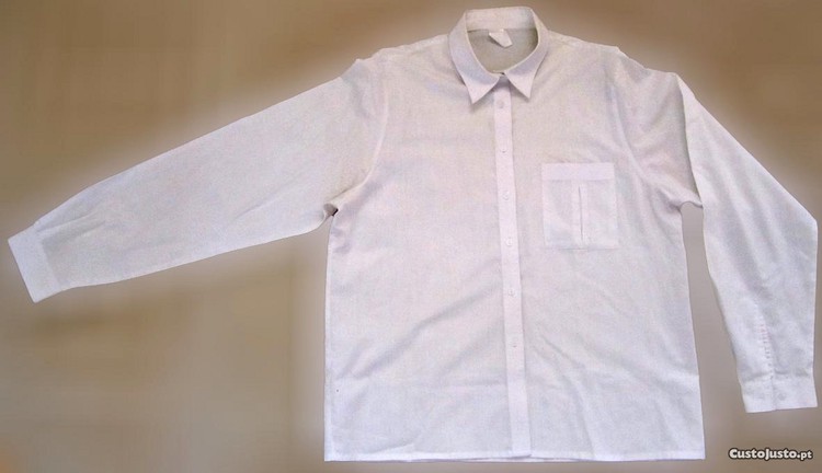 É de boa qualidade, muito leve e fresca. De cor completamente branca, não possui quaisquer estampagem e tem uma ligeira transparência. Com corte clássico, possui um bolso com pinça ao peito, do lado esquerdo. Abotoa à frente e nos punhos com botões de camisa transparentes. Tem um estilo muito clássico e prático, é muito confortável, combinando muito bem com qualquer tipo de estilo e ocasião, sejam elas mais formais ou mais descontraídas.